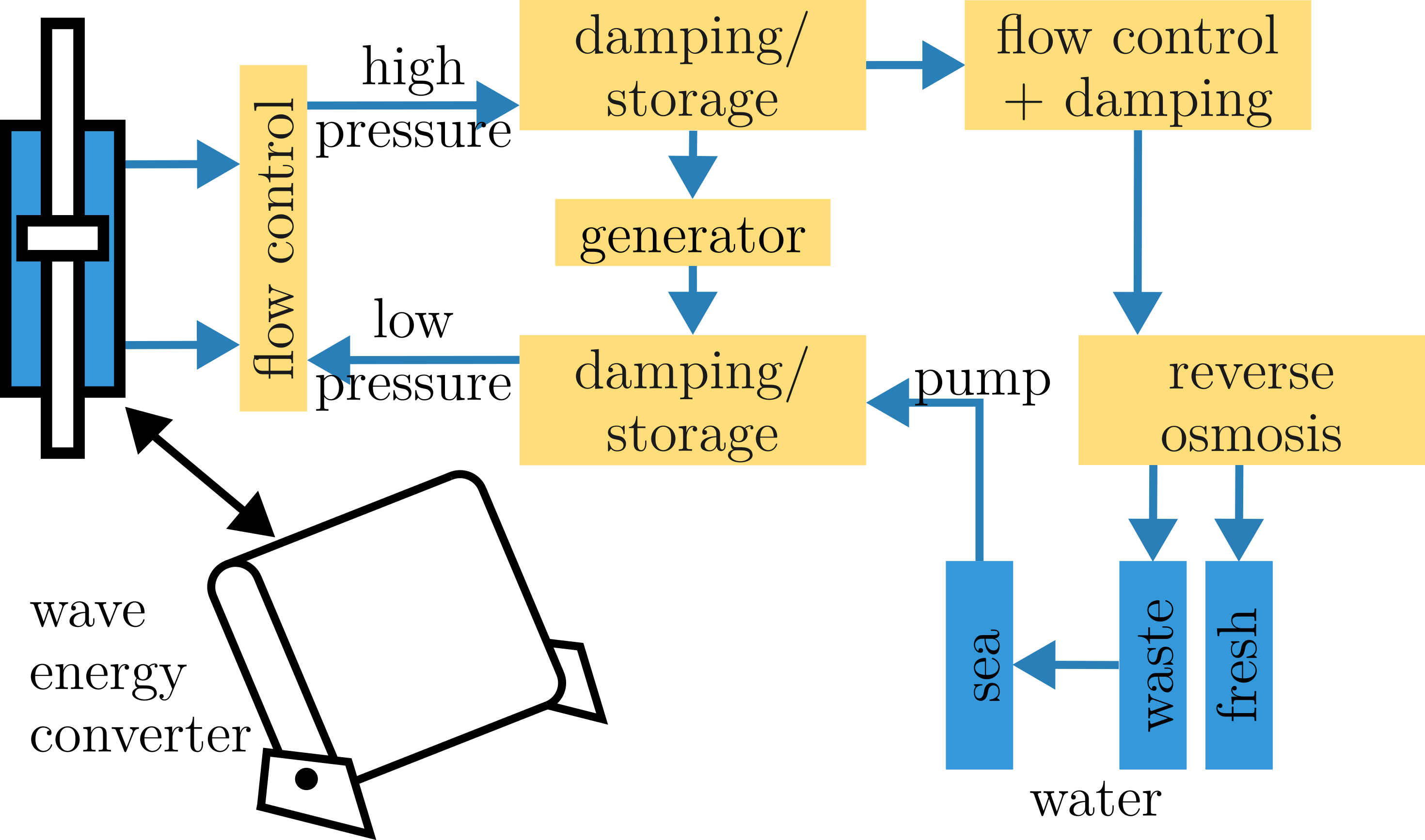 A self-powered and decentralized wave energy converter and desalination system was proposed in prior work by the MEPS lab. The wave energy is harvested using a large oscillating flap hinged at the sea bed, whose kinetic energy is then transferred into hydraulics; the pressurized seawater is used to generate electricity and freshwater. Figure above showcases these primary traits.