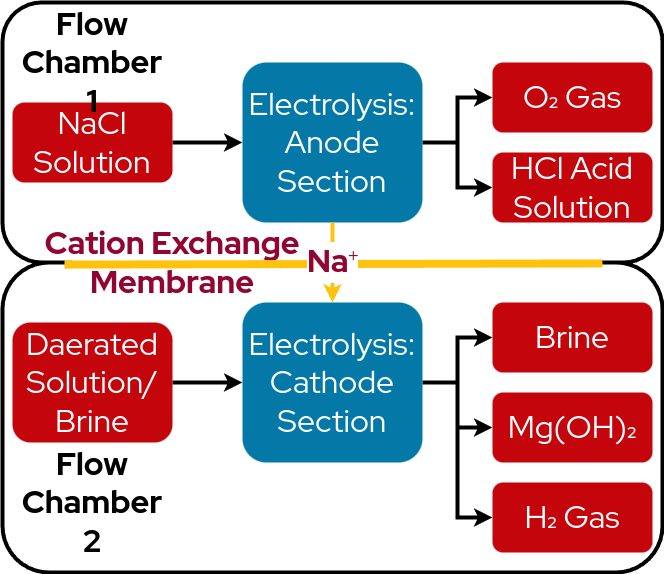 My role over the summer was researching the extraction of bivalent ions, primarily magnesium ions, from seawater. I determined and analyzed the energy and cost requirements for all the methods related with magnesium salt extraction and conversion to pure magnesium metal. Figure below showcases the utilization one of the methodologies that I had to test to determine its effectiveness, and figure above showcases a method by Sano et al. 2018. I went beyond and researched pre-treatment of seawater, extraction of calcium, and concentration of seawater and its inaccuracies.